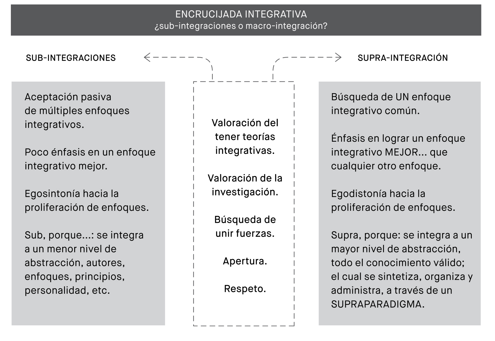 De este modo, en el contexto de nuestro Supraparadigma Integrativo, no se sentiría cómodo un Freud, un Rogers, un Guidano… Tampoco se sentiría cómodo el enfoque psicoanalítico, el humanista o el post racionalista... Paradójicamente – dados los múltiples errores en los que ha incurrido cada uno de ellos – nos resultaría preocupante que, al interior de nuestro Supraparadigma, alguno de estos autores o enfoques se sintiera "cómodo".
