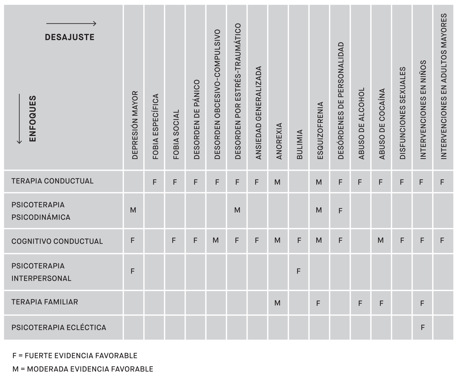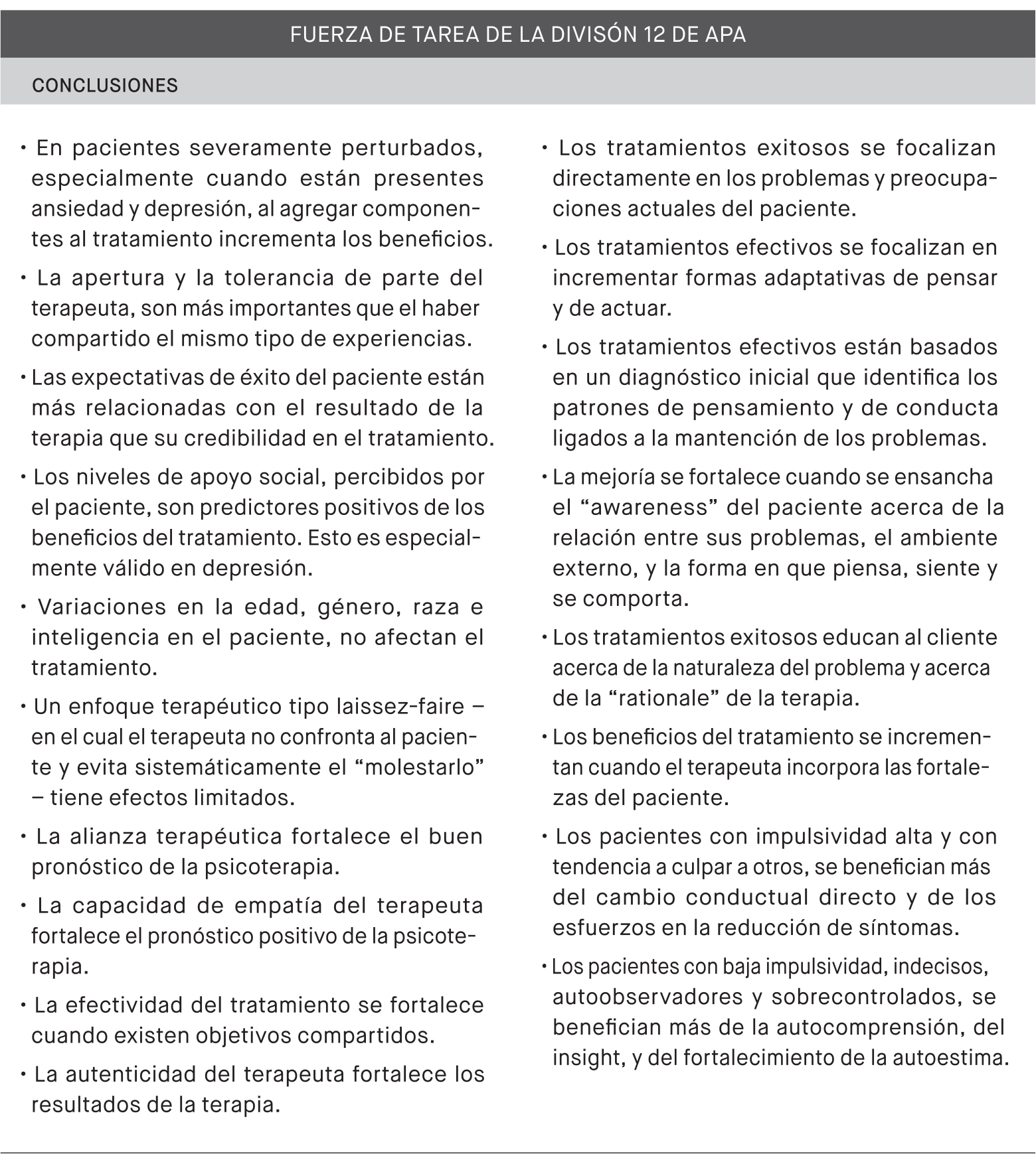 En una línea complementaria y bajo la Presidencia de Larry Beutler (2002-2003), otra Fuerza de Tarea, esta vez ligada a laDivisión 12 de la apa,abordó una temática que fue más allá de las variables de la relación terapéutica. Integrada por profesionales de muy alto prestigio, esta Fuerza de Tarea centró su trabajo en evaluar el aporte dediversas variables y de diversos métodos de tratamiento, a desórdenes disfóricos, desórdenes de ansiedad, trastornos de personalidad y abuso de sustancias. Es importante enfatizar que no se procuró evaluar enfoques completos, aplicados a desórdenes específicos. El Recuadro 8 sintetiza algunos de los hallazgos de la Fuerza de Tarea de la División 12.