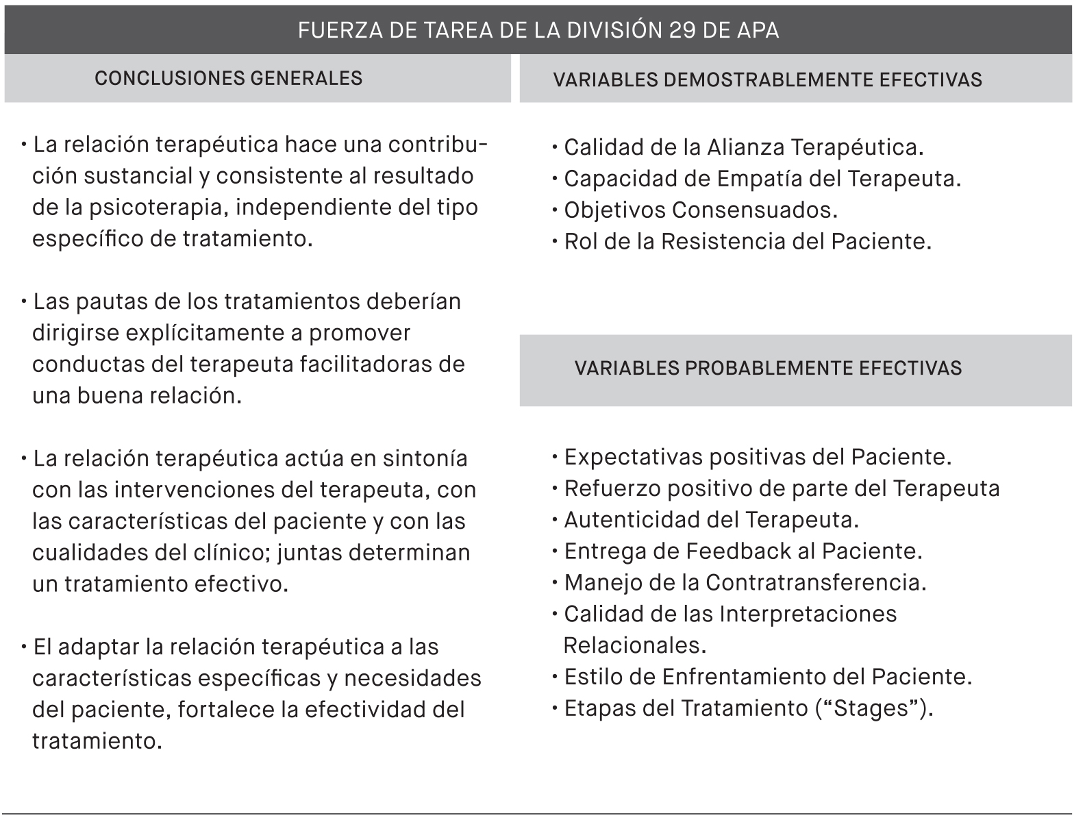 En el ámbito de las "relaciones terapéuticas con apoyoempírico", resulta aportativo el explicitar algunas de las conclusiones de la Fuerza de Tarea de la División 29 de la apa. Esta Fuerza de Tarea trabajó los años 1999, 2000 y 2001, bajo las sucesivas presidencias de Wade Silverman, John Norcross y Diane Willis; diversos psicoterapeutas e investigadores del más alto nivel fueron sus integrantes. El Recuadro 7 muestra algunas de sus conclusiones.