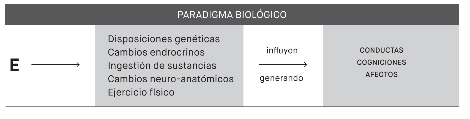 En el paradigma biológico, la idea de fondo, es que la biología fundamenta la dinámica psicológica; y que algún grado de facilitación biológica estaría a la base de múltiples desajustes psicológicos. El Recuadro 10 grafica el accionar del paradigma biológico.