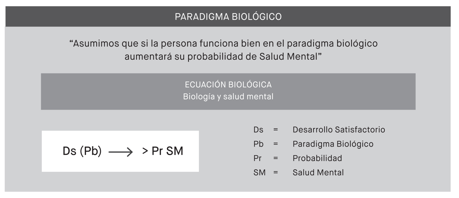 La ecuación anterior permite enfatizar el hecho que, si bien un perfil satisfactorio del paradigma biológico aumenta la probabilidad de salud mental en la persona, esto no implica el que pueda garantizar la salud mental de esa persona. Es así que, cualquier persona, puede padecer importantes disfunciones psicológicas, generadas en territorios diferentes de las disposiciones genéticas, de los desbalances endocrinos, etc. En otras palabras, aun cuando todo hecho psíquico – sea este una cognición, una emoción, etc. – , posee un correlato biológico, las disfunciones psicológicas se pueden generar en territorios diferentes del "paradigma biológico". Esto nos obliga a explorar en plenitud esos otros territorios.