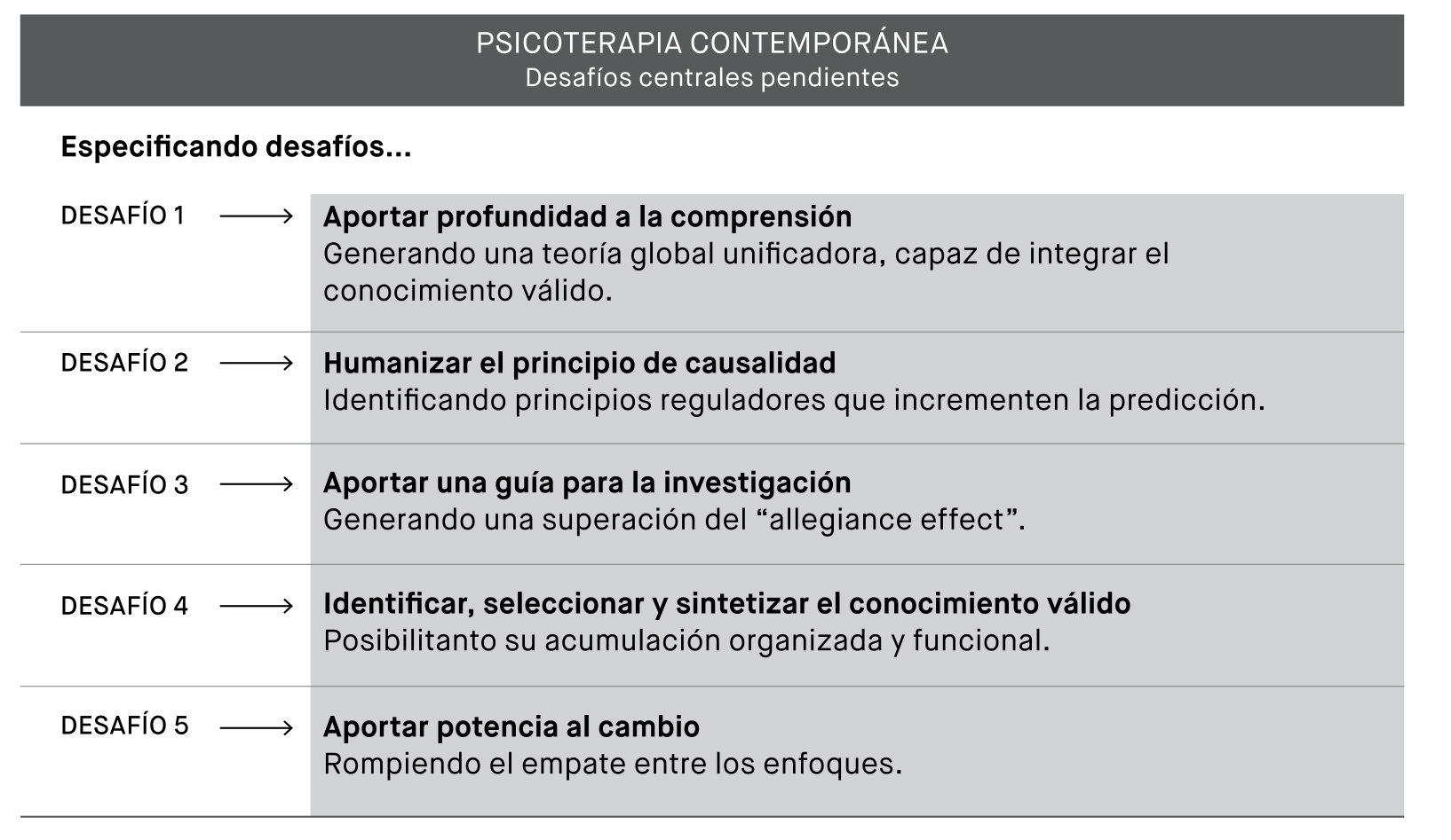 El análisis precedente nos ha permitido decantar cinco desafíos… cuyo mejor abordaje resulta esencial para la evolución futura de la psicoterapia. No se trata de que sea "deseable" enfrentarlos. Tampoco se trata de que sea "relevante" enfrentarlos. Más bien, se trata de que es indispensable, urgente e insoslayable el enfrentarlos… si no deseamos continuar moviéndonos en círculos como disciplina.