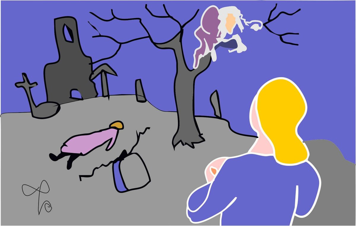Тем временем к пруду подошла Валентина, довольно быстра она сообразила в чём дело и бросилась на крик. Девочки понеслись на кладбище, которое было от них недалеко. Саша с орущим комочком встала в центре, Лёня пряталась с краю.
