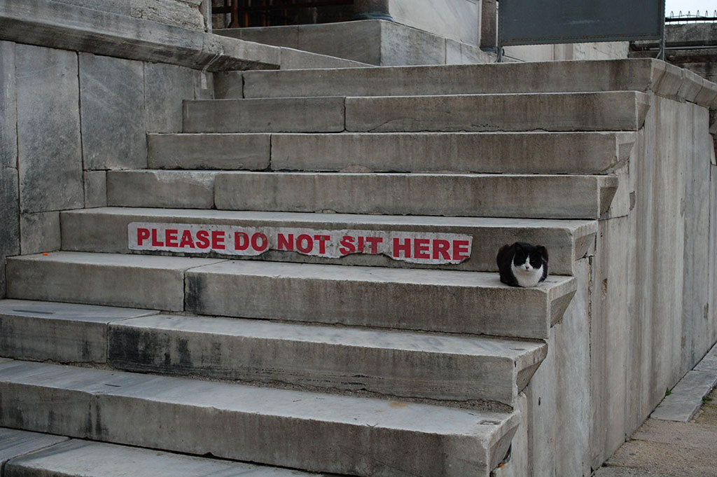 На фотографии чёрно-белый кот беззаботно спал на лестнице у мечети. Надпись на ступеньке призывала: «Пожалуйста, не сидите здесь». Заголовок нахально гласил: «Моя жизнь – мои правила». Ниже красовались хештеги: #котикиспасутмир #стамбул2019