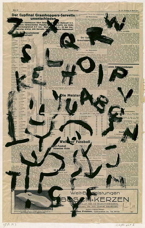 Bei der Zeitung handelt es sich um die «National-Zeitung», die im Februar jenes Jahres, also einen Monat vor dem Anschluss, in Wien zusammen mit der «Neuen Zürcher Zeitung» beschlagnahmt worden war. Die bedruckte Seite, die Paul Klee benutzt, ist die Seite 13 (glaubte Paul Klee an die magische Kraft der Zahlen?), die Sportseite: die mit dem Bericht über den Cupfinal des Vortages. Mit gewiss blitzschneller Hand, der Hand eines himmlischen Diebes («Kein O noch I schreibt man mit solcher Schnelle»), malt Klee, da die Vorbereitung des Bildes rein mental war («meine Tragödie ist fertig, ich muss sie nur noch aufschreiben»), auf das Blatt aus der «National-Zeitung» die Buchstaben des Alphabets samt einiger Hieroglyphen, die wie Masken anmuten: Zeichen einer Sprache, «die man nicht mehr kennt»? Der Gesang der Vögel, der Flug der Schwalben, die Sprache der Zigeunerinnen?