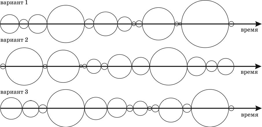 Рис. 2. Схематическое изображение трёх вариантов (из бесчисленного множества возможных) качественных преобразований состояний симультанно проявляемых фокусных Конфигураций «нашей Вселенной».