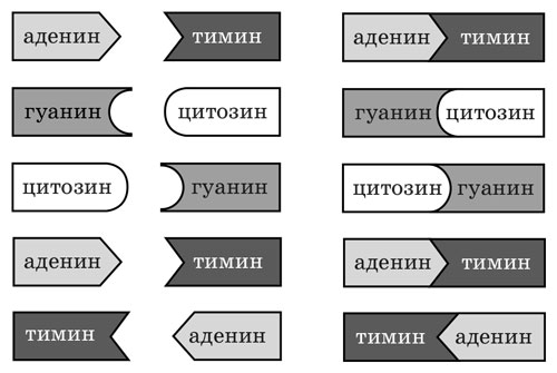 5.841. Генóм каждого человека состоит из четырёх типов субъединиц: аденина, тимина, гуанина и цитозина, которые называются нуклеотидами. При этом ДНК имеет структуру двойной спирали, цепи которой способны разделяться с помощью специальных ферментов, служа матрицами при синтезе дочерних молекул. Важнейшим условием образования этой двойной спирали является свойство комплементарности: Информация, содержащаяся в каждом гене, закодирована особым порядком размещения этих субъединиц – против аденина одной из цепей всегда находится тимин другой цепи, в то время как гуанин всегда соединён только с цитозином. Для нас с вами очень важно знать и помнить о том, что любая биохимическая реакция, происходящая в нашем организме, контролируется определённым ферментом, производство которого, в свою очередь, может контролироваться Творцами-интерпретаторами как одного, так и нескольких генов.