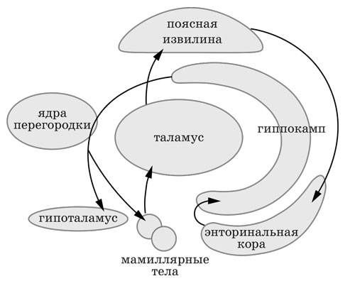 гиппокамп <=> свод <=> перегородка <=> мамиллярные тела <=> передние ядра таламуса <=> поясная извилина <=> гиппокамп.