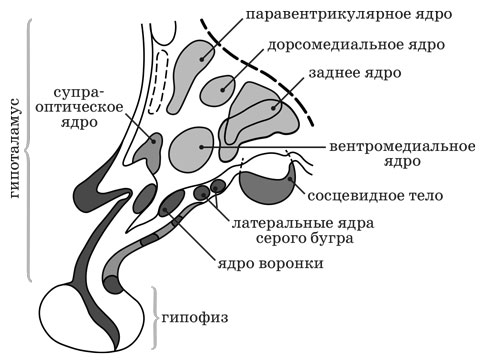 5.967. Гипоталамус, являясь одновременно и частью промежуточного мозга, и эндокринным органом, имеет в своей структуре около 40 парных ядер, чьи Творцы через гипоталамо-гипофизарный тракт (содержит более двухсот тысяч волокон) постоянно и очень активно взаимодействуют с Творцами гипофиза, а также других эндокринных желез, регулируя процессы выработки ими собственных гормонов. Благодаря этому Творцы гипоталамуса выполняют очень важную функцию в формировании реакций остальных Творцов организма на возникающие стрессовые ситуации. Крупные нейроны передней части гипоталамуса вырабатывают гипоталамические нейропептиды – вазопрессин (в супраоптическом ядре) и окситоцин (в паравентрикулярном ядре), которые в синаптических передачах могут выполнять функции и нейрогормонов, и нейротрансмиттеров (медиаторов или модуляторов). В других областях гипоталамуса образуются рилизинг-факторы, выполняющие функции гипофизарных стимуляторов (либерины) и ингибиторов (статины). Кроме того, гипоталамусом вырабатываются энкефалины и эндорфины – гормоны, оказывающие морфиноподобное действие.