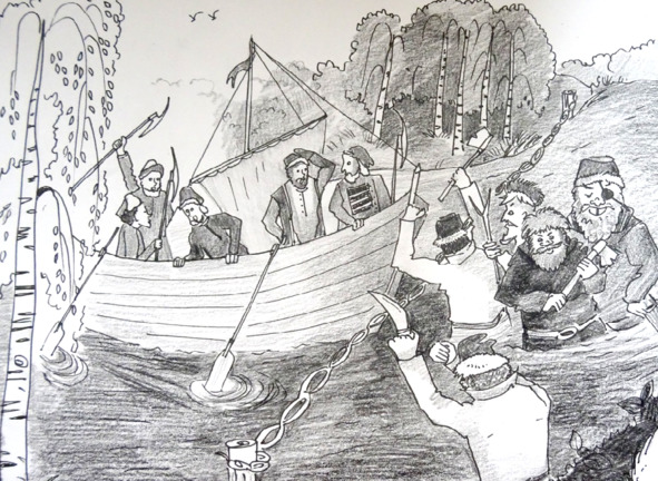 «Здесь же натягивалась цепь, и корабль попадал в ловушку. Из леса выскакивали разбойники, расправлялись с купцами, рубя им головы» (рисунок Надежды Граве)