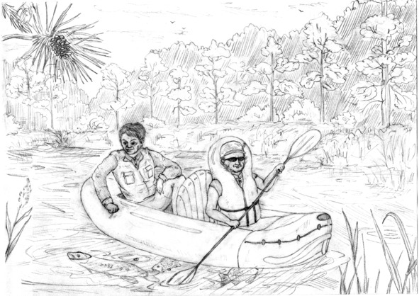 «Это был незабываемый поход на байдарке. Кубена с красивыми берегами, ее голубые прозрачные воды, то тут, то там всплески крупных экземпляров. Некоторые рыбины проплывали прямо под лодкой, и мы завороженным взглядом сопровождали их стремительные движения» (рисунок Елены Стальновой)