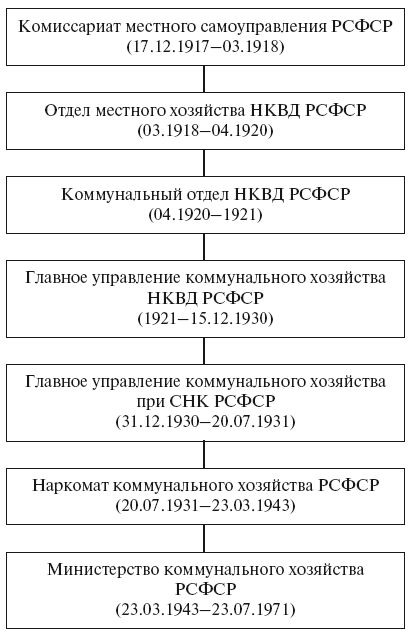Вторым фактором, определяющим функционирование советского ЖКХ в рассматриваемый период, стала организационная и структурная перестройка сферы управления данной отраслью. После Октября 1917 г. в течение некоторого времени, как мы видели выше, продолжали действовать органы городского и земского самоуправления, деятельность которых в масштабах страны координировал Комиссариат местного самоуправления[82]. Однако 20 марта 1918 г. он был ликвидирован, а функции руководства коммунальным хозяйством были переданы Наркомату внутренних дел (рис. 1.1). Одновременно с ликвидацией земств и городских дум ликвидировались отделы земского и городского хозяйства. На местах эти функции возлагались на учрежденные при городских и районных (а также губернских и уездных) исполкомах Советов отделы коммунального хозяйства, которые подчинялись отделу местного хозяйства НКВД, переименованному в 1920 г. в коммунальный отдел[83].