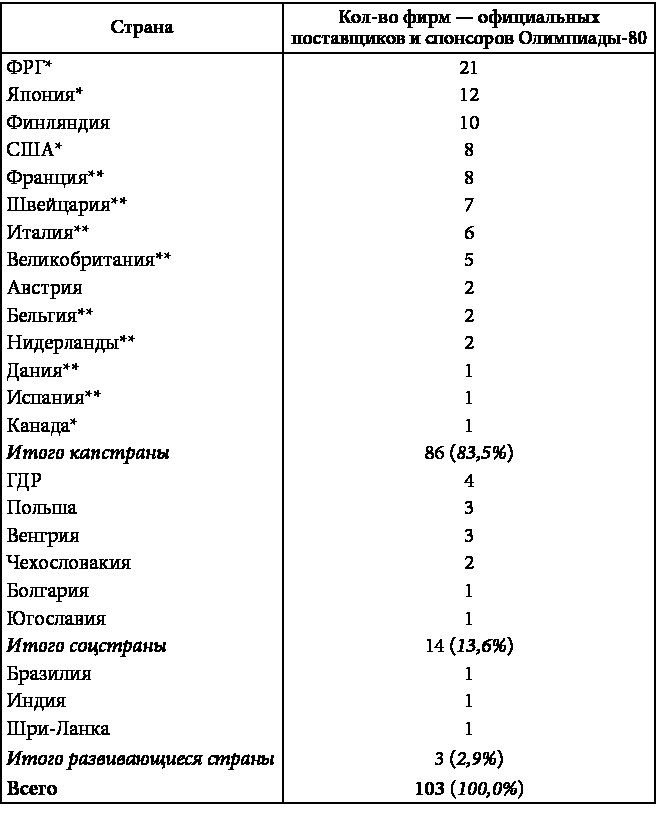 В общем списке официальных поставщиков и спонсоров Олимпиады, включавшем 103 зарубежные компании, соцстраны были представлены только 14 компаниями. Важнейшими зарубежными партнерами Оргкомитета «Олимпиада‐80» были фирмы из тех стран, спортсмены которых из‐за бойкота вообще не прислали свои спортивные команды в СССР (США, ФРГ, Япония, Канада) или же спортсмены которых выступали под флагом МОК (табл. 2.3)315.