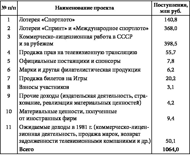 Видно, что именно к внутренним источникам финансирования Олимпиады‐80 можно отнести только п. 1, обеспечивший около 13,2% всех поступлений. Полностью из зарубежных источников были получены средства по пп. 4, 5, 8 и 10 (76 млн руб., или 7,1% от общего объема поступлений). Что касается доходов по пп. 2, 3, 6, 7, 9 и 11, то они составили 847 млн руб., или 79,6% от всех поступлений. Но разделить эти средства на внутреннюю и внешнюю составляющие не представляется возможным.