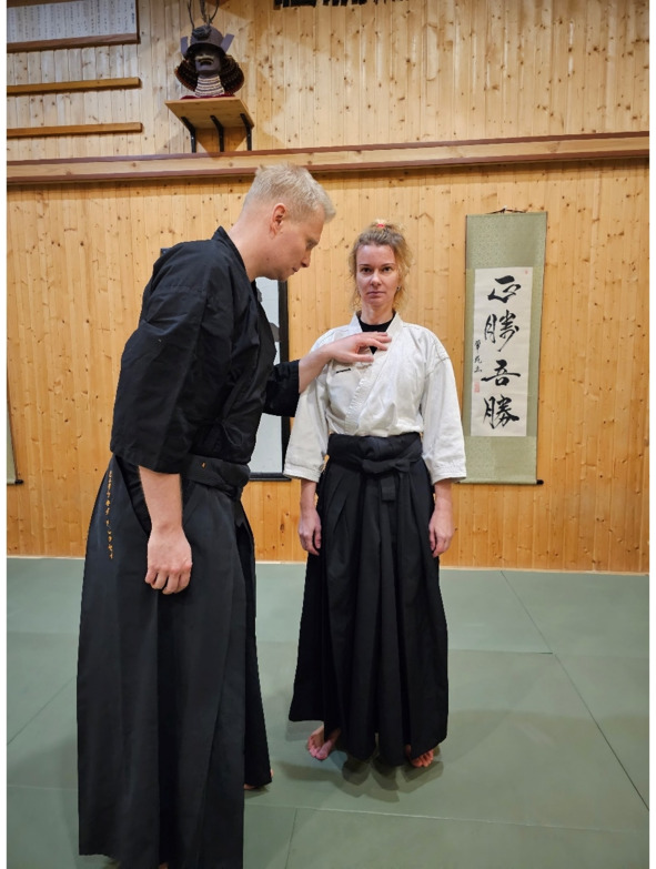 Затем партнёр Б более решительно толкает разные части тела партнёра А (грудь, спину, плечо, колено и т.д.). Если партнёр А напрягается, он в конечном итоге потеряет равновесие и упадёт на пол. Проблема заключается в потере партнёром А целостного восприятия, когда его разум перемещается от одной точки к другой (фото 7).