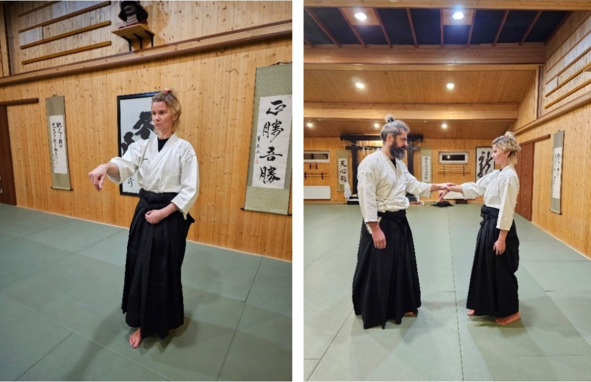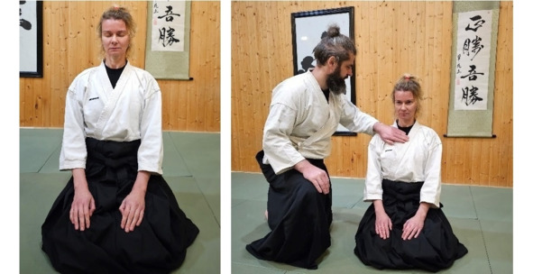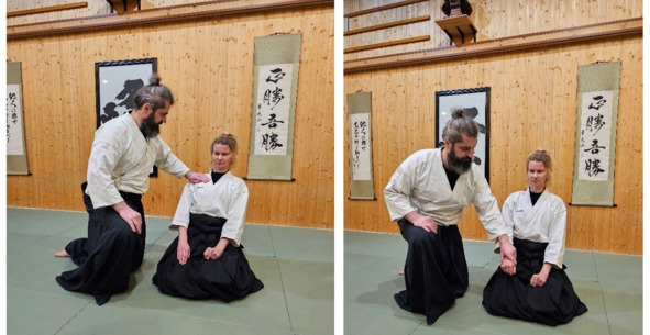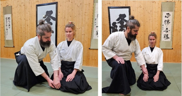 Партнёр А стоит спокойно, протягивая руку вперёд. Партнёр Б пытается толкнуть А за запястье, при этом рука А либо поднимается, либо тело А теряет равновесие и покачивается назад (фото 10).