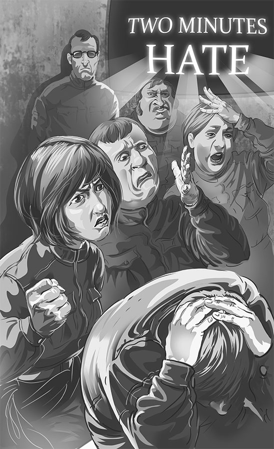 In its second minute the Hate rose to a frenzy. People were leaping up and down in their places and shouting at the tops of their voices in an effort to drown the maddening bleating voice that came from the screen. The little sandy-haired woman had turned bright pink, and her mouth was opening and shutting like that of a landed fish. Even O’Brien’s heavy face was flushed. He was sitting very straight in his chair, his powerful chest swelling and quivering as though he were standing up to the assault of a wave. The dark-haired girl behind Winston had begun crying out ‘Swine! Swine! Swine!’ and suddenly she picked up a heavy Newspeak dictionary and flung it at the screen. It struck Goldstein’s nose and bounced off; the voice continued inexorably. In a lucid moment Winston found that he was shouting with the others and kicking his heel violently against the rung of his chair. The horrible thing about the Two Minutes Hate was not that one was obliged to act a part, but, on the contrary, that it was impossible to avoid joining in. Within thirty seconds any pretence was always unnecessary. A hideous ecstasy of fear and vindictiveness, a desire to kill, to torture, to smash faces in with a sledge-hammer, seemed to flow through the whole group of people like an electric current, turning one even against one’s will into a grimacing, screaming lunatic. And yet the rage that one felt was an abstract, undirected emotion which could be switched from one object to another like the flame of a blowlamp. Thus, at one moment Winston’s hatred was not turned against Goldstein at all, but, on the contrary, against Big Brother, the Party, and the Thought Police; and at such moments his heart went out to the lonely, derided heretic on the screen, sole guardian of truth and sanity in a world of lies. And yet the very next instant he was at one with the people about him, and all that was said of Goldstein seemed to him to be true. At those moments his secret loathing of Big Brother changed into adoration, and Big Brother seemed to tower up, an invincible, fearless protector, standing like a rock against the hordes of Asia, and Goldstein, in spite of his isolation, his helplessness, and the doubt that hung about his very existence, seemed like some sinister enchanter, capable by the mere power of his voice of wrecking the structure of civilization.