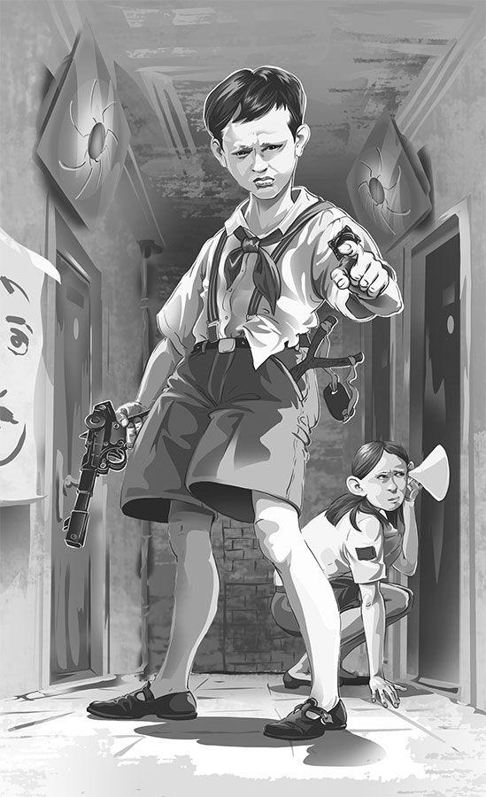 A handsome, tough-looking boy of nine had popped up from behind the table and was menacing him with a toy automatic pistol, while his small sister, about two years younger, made the same gesture with a fragment of wood. Both of them were dressed in the blue shorts, grey shirts, and red neckerchiefs which were the uniform of the Spies. Winston raised his hands above his head, but with an uneasy feeling, so vicious was the boy’s demeanour, that it was not altogether a game.