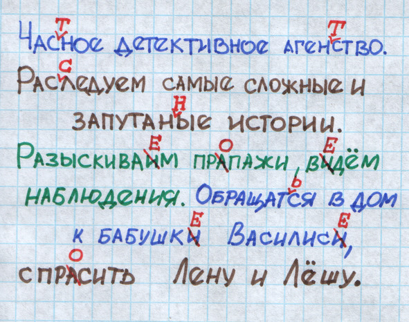 «Часное детективное агенство. Раследуим самые сложные и запутаные истории. Разыскиваим прапажи, видём наблюдения. Обращатся в дом к бабушки Василиси, спросить Лену и Лёшу».