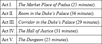SCENEThe Market Place of Padua at noon; in the background is the great Cathedral of Padua; the architecture is Romanesque, and wrought in black and white marbles; a flight of marble steps leads up to the Cathedral door; at the foot of the steps are two large stone lions; the houses on each aide of the stage have coloured awnings from their windows, and are flanked by stone arcades; on the right of the stage is the public fountain, with a triton in green bronze blowing from a conch; around the fountain is a stone seat; the bell of the Cathedral is ringing, and the citizens, men, women and children, are passing into the Cathedral.