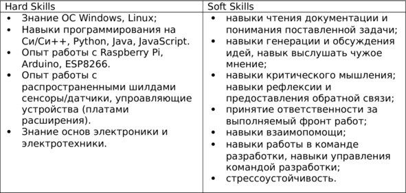 «Soft skills»: навыки чтения документации и понимания поставленной задачи; навыки генерации и обсуждения идей, навык выслушать чужое мнение; навыки критического мышления; навыки рефлексии и предоставления обратной связи; принятие ответственности за выполняемый фронт работ; навыки взаимопомощи; навыки работы в команде разработки, навыки управления командой разработки; стрессоустойчивость.