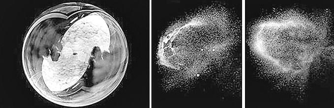 Перед тем как лопнуть, толщина пленки мыльного пузыря становится минимальной – меньше 25 нанометров. В этот момент все отражающиеся волны видимого света складываются в противофазе. Тогда мы перестаем видеть отражение совсем, потому что на темном фоне эта часть пузыря выглядит «черным пятном» (рис. 26) (https://www.youtube.com/watch?v=F2TF913s2ZE).