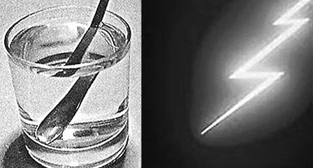Рис. 32. Фрактальность образа молнии и преломление ложки в стакане воды