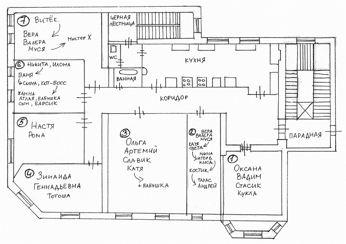 Данная схема пронумерованных комнат представляет карту социальной драматургии отдельно взятой коммунальной квартиры, где каждый номер комнаты отсылает к глоссарию действующих лиц. Схема позволяет наглядно представить топологию разворачиваемых взаимодействий между персонажами (социальными акторами).