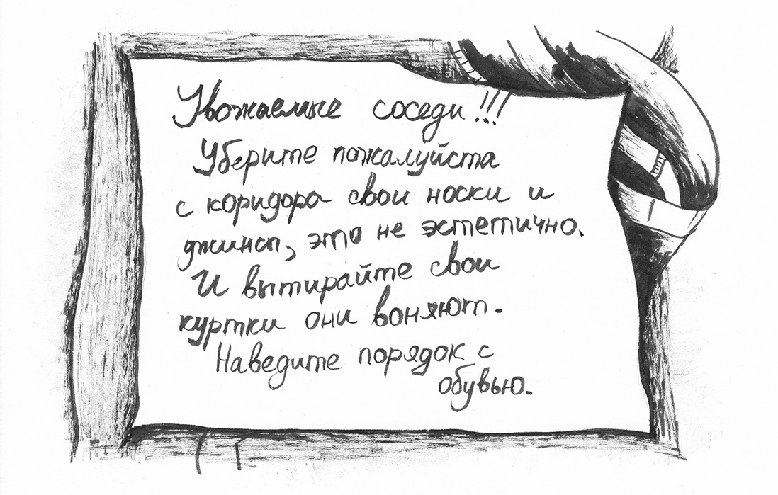 Сегодня должны были прийти фотографы из The Village, Виктор и его жена Ирина, чтобы снимать нашу коммуналку и нас на ее фоне. Настя попросила их взять с собой сменные тапки, чтобы быстро переодеться и прошмыгнуть в комнату, пока Зинаида Геннадиевна и другие жильцы не почуяли неладное. Но соседи как назло все повылезали из своих комнат и позаканчивали свои смены. Даже запойный Витек решил намыть недельную горку своей грязной посуды. По кухне скачет стиральная машина. Над нашим пеналом огромная протечка с кровли. Зинаида Геннадиевна вернулась со смены. Оделась в розовую пушистую пижаму, наделала бигудей. Бегает по кухне, обзывает всех свиньями.