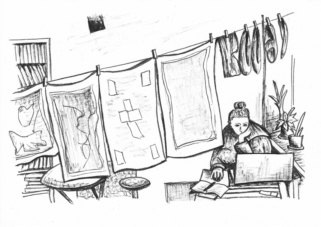 Возвращаешься ты с лекции по эстетике, которую читал для «Школы ангажированного искусства» в ДК Розы Люксембург, а в родной коммунальной комнате прямо посреди рабочих будней Насти Вепревой расцвело свое искусство— цветастые полотенца с банальными изображениями девочек, цветочных вазочек и фруктиков, вперемешку с реди-мейдами трусиков, будто бы иллюстрирующие тезисы французского философа Жака Рансьера о том, что сегодня мы определяем, что является искусством, а что – нет, не в зависимости от техники и объекта изображения, а от принадлежности к определенному способу чувствования.