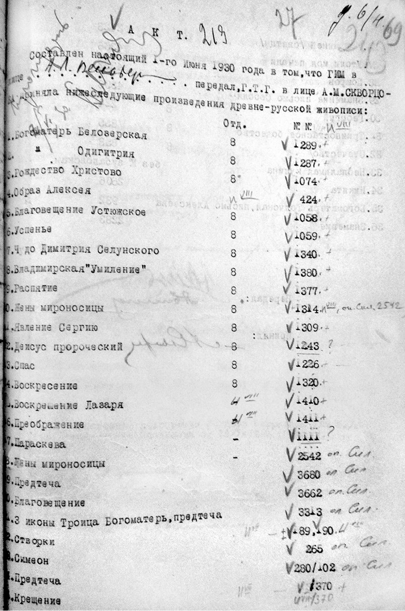 Акт № 279 от 3 августа 1930 года. Самые горькие потери Исторического музея. В списке на передачу в Третьяковскую галерею значатся иконы домонгольского времени, «Богоматерь Владимирская» и «Ангел Златые власы», а также икона «Богоматерь Донская», которую по преданию казаки преподнесли князю Дмитрию перед битвой на Куликовом поле, и другие шедевры Древней Руси. Исторический музей