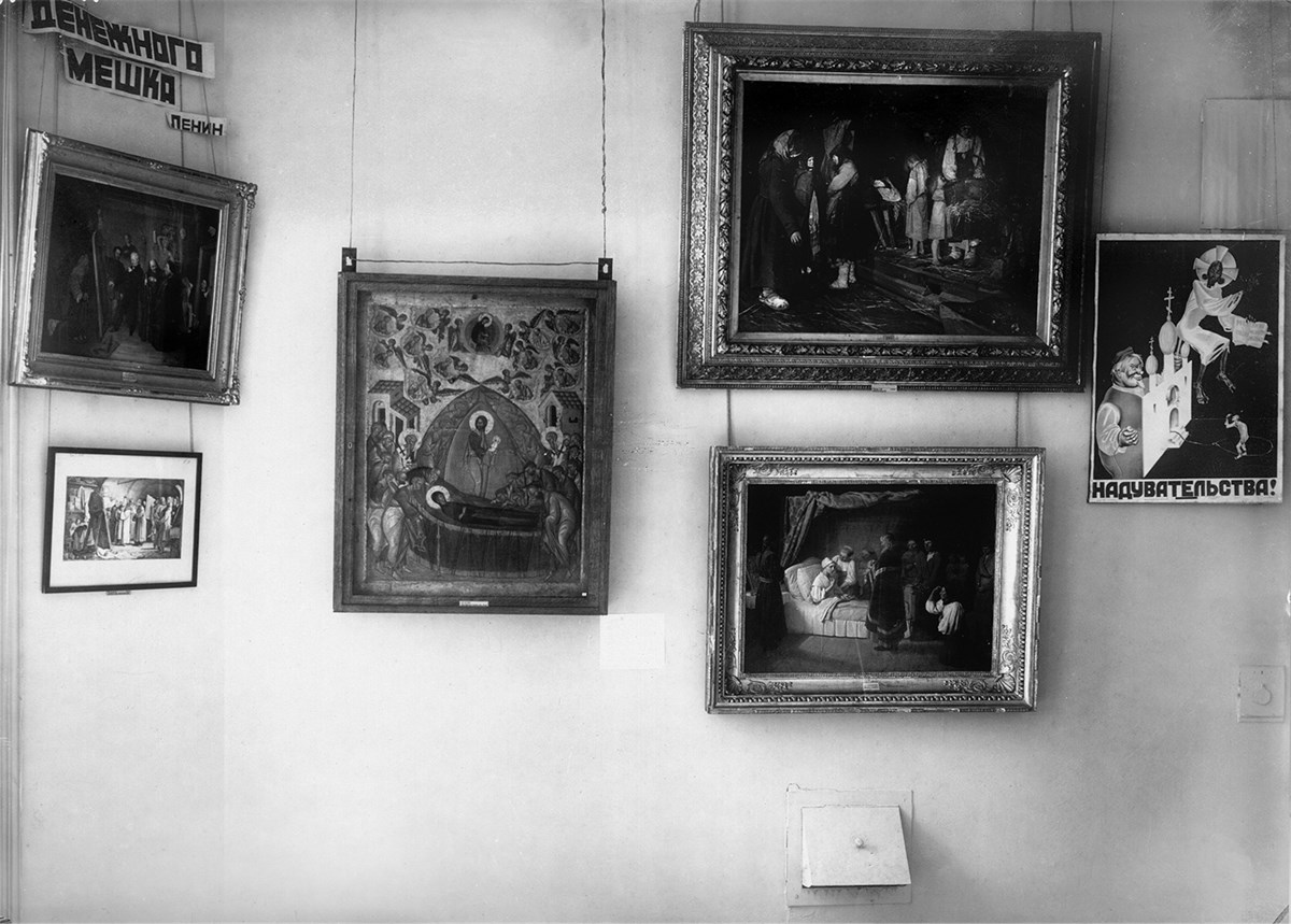Антирелигиозная выставка в ГТГ (1930 год; авторы экспозиции В. Р. Герценберг и А. С. Галушкина) обличает церковь в обмане народа и рьяном служении интересам «денежного мешка» – капиталистов, купечества и верховной власти. В центре – икона «Успение» (ок. 1497, входит в современную постоянную экспозицию ГТГ). Слева от нее (верхний ряд) – картина В. В. Пукирева «В мастерской художника» (1865). Купец карикатурного вида выбирает икону для домовой церкви. Ему услужливо помогает священник. Под ней небольшая работа В. М. Васнецова «Княжеская иконописная мастерская» (1879). Справа от «Успения» (нижний ряд) картина А. Г. Венецианова «Причащение умирающей» (1839). Обличительную направленность экспозиции определяют цитата Ленина, которая задает тон просмотру, и воинствующий плакат «Надувательства» (крайний справа). Именно они превращают художественную экспозицию в политическую агитку. Государственная Третьяковская галерея