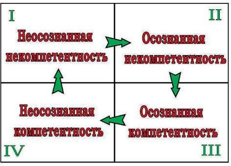 Первоначально сотрудник находится в квадранте I – «Неосознанной некомпетенции», который означает: «Я не знаю, что я не знаю», то есть человек даже не догадывается о том, что ему нужны какие-то знания, и он что-то не знает. Если человек сталкивается с ситуацией, в которой он понимаем, что ему не хватает знаний, то возникает «Осознанная некомпетенция», то есть человек перешёл в квадрант II. Однако, неизвестно, как быстро он попадёт в ситуацию, в которой сможет получить такой опыт. И сможет ли он в ситуации ежедневной текучки осознать, что ему нужны знания. Поэтому разумно в рамках компании не дожидаться, когда произойдёт осознание и внутренняя потребность руководителя учиться, а начать его учить сразу же, как он был назначен на руководящую должность. А осознанность обучения создаётся специальными тренинговыми приёмами – даются задания, показывающие существующие проблемы.