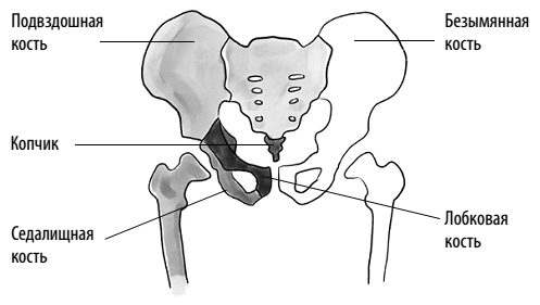 Таз состоит из двух безымянных костей. Почему безымянных? Потому что одна половинка таза – это три сросшиеся кости: подвздошная, седалищная и лобковая (лонная).