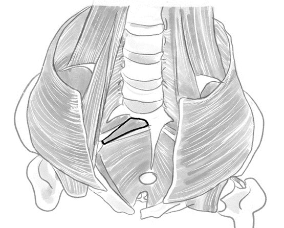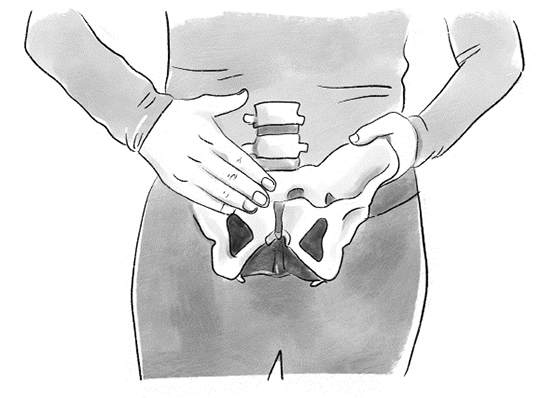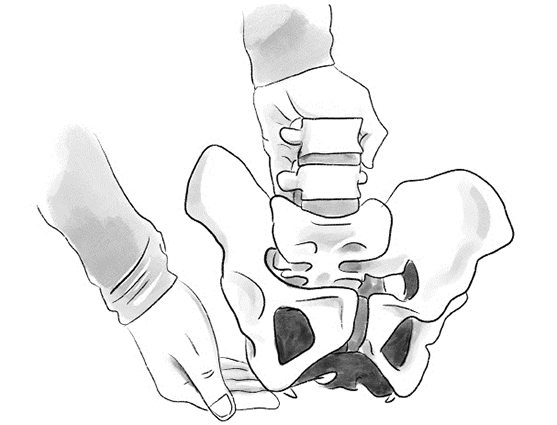 Теперь расположите ладонь пальцами вниз сзади так, чтобы основание ладони оказалось внизу поясницы практически у начала межъягодичной складки, а средний палец уходил вниз по ней. Под пальцем вы найдете копчик, он служит продолжением крестца.