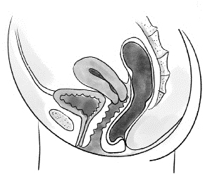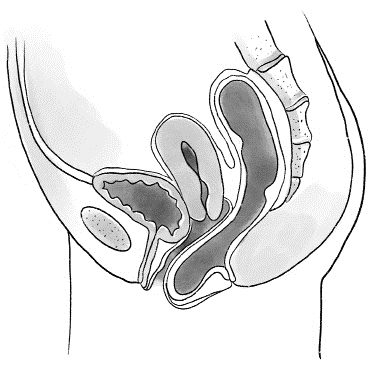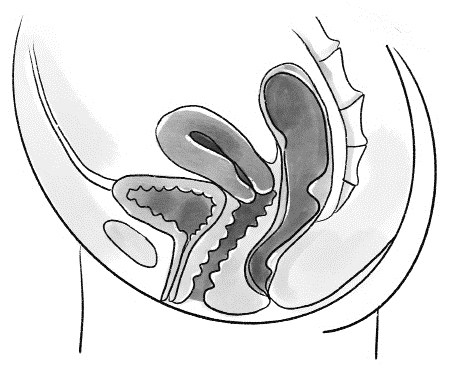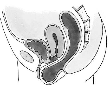 Между вагинальным каналом и копчиком находится прямая кишка. Основная ее функция – накопление и выведение каловых масс. Я уже писала о важности регулярной дефекации и отсутствии запоров. Если у вас нерегулярный стул и есть склонность к запорам, каловые массы копятся и растягивают прямую кишку. Она, в свою очередь, давит на заднюю стенку вагинального канала. Посмотрите, как выглядит опущение прямой кишки, на иллюстрации ниже.