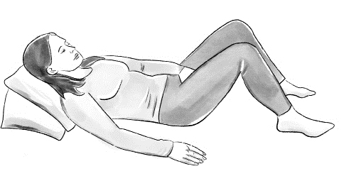 Лягте на спину и согните ноги в коленях, под голову и плечи положите высокую подушку. Расположите ладонь на промежности.