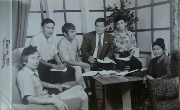 1995—жыл. Бишкек. Ноокат Билимкананы колдоочулары: (солдон оңго) китептин автору Замирбек Өсөров, журналист Назаркул Жоошбаев, ишкер Абдисалим Чылымов, агартуучу Омурзак Мамаюсупов, IT-менеджер Нурбек Имакеев, агартуучу Саадат Сатарова.