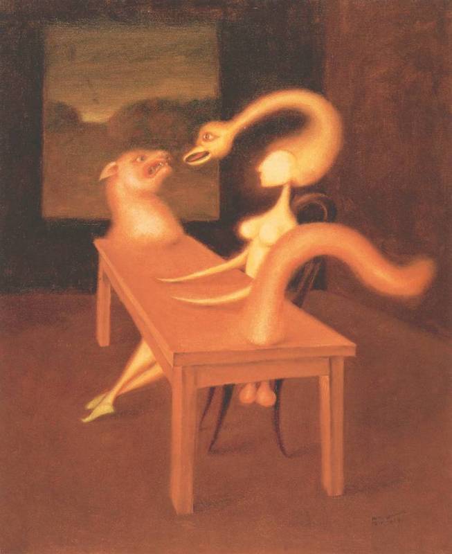 В качестве характерного примера использования образов в творчестве сюрреалистов может послужить полотно В. Браунера «Чары» (1939). Художник изобразил женщину, похожую на тряпичную куклу, сидящую за живым столом, который на глазах превращается в зловещих оскаленных животных, легко узнаваемых или просто зооморфных объектов, и даже волосы безжизненной дамы оживают, превращаясь в птичью голову на извивающейся змеиной шее. Подобные гибриды вообще были свойственны творчеству этого французского художника.
