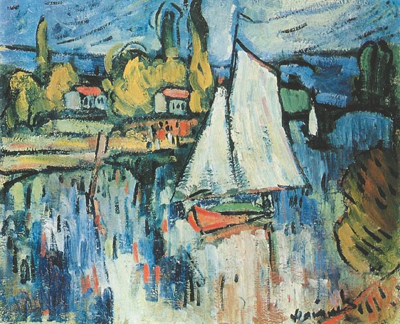 В этот период полотна живописца поражают свежестью и сочностью цветовой гаммы. Излюбленные краски Вламинка – лимонная, ультрамариновая и зеленая, как изумруд. Замечательна композиция «Набережная в Булоне» (1900, частное собрание). Первый план картины занимает сочная зелень молодой травы, далее сверкает река, а за ней виден противоположный берег с веселой цепочкой провинциальных домов. В то же время уже здесь чувствуется отход от основных принципов импрессионизма, поскольку цель Вламинка – не столько передать впечатление от природы, сколько изобразить собственное, индивидуальное чувство, вызываемое окружающей средой. Контуры предметов живописец очерчивает очень четко и заполняет внутреннее пространство насыщенными красками. Лишь небо исполнено в духе импрессионистов – оно прозрачно и наполнено легким движением воздуха. Подобное ощущение создается благодаря стремительным и легким бело-голубым мазкам.
