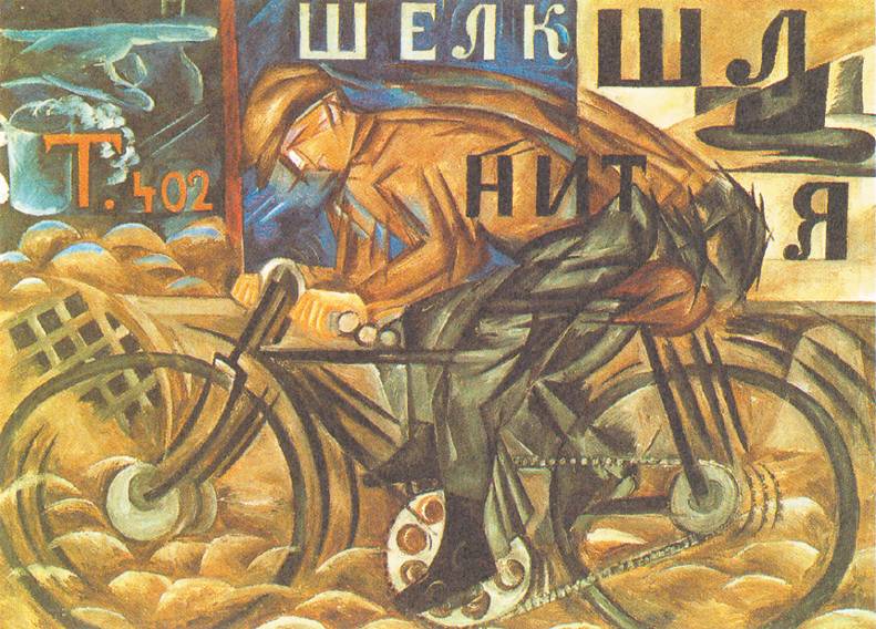 В том же году Гончарова написала свое знаменитое полотно «Велосипедист» (Государственный Русский музей, Санкт-Петербург), где художнице удалось поразительно точно передать скорость движения. Сливаются мелькающие мимо велосипедиста лавочные вывески, расслаиваются от быстрого движения колеса и сам человек, пригнувшийся к рулю.