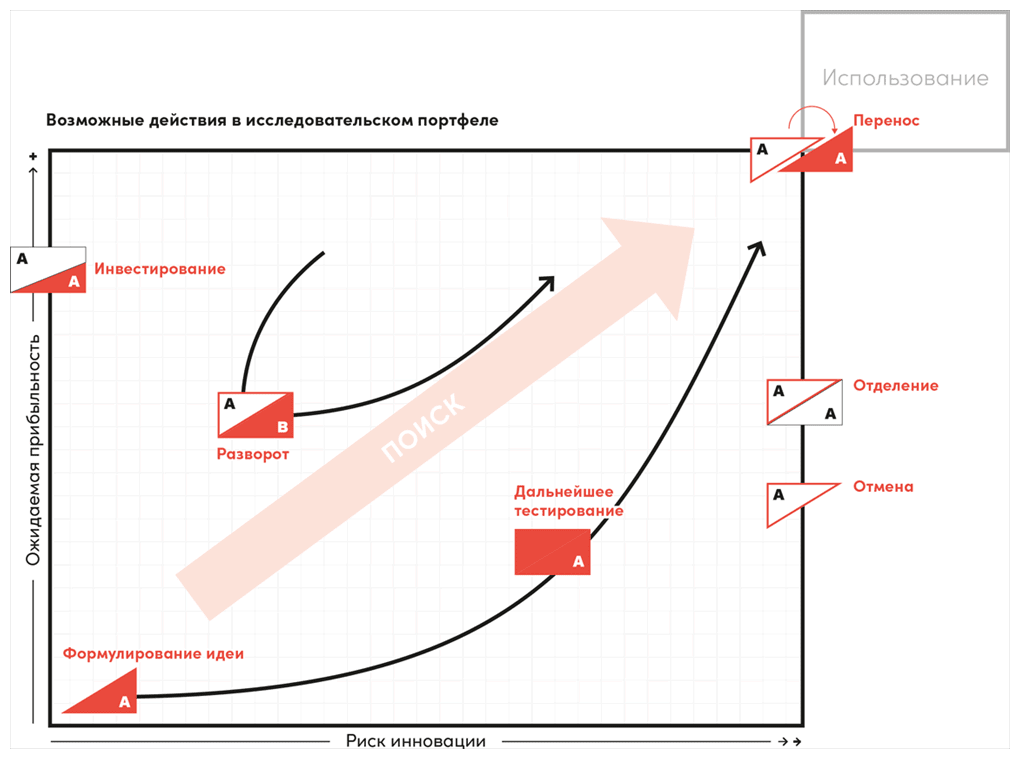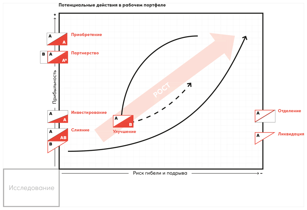 В рабочем портфеле вы можете выполнять семь действий. Все они связаны с управлением существующими бизнес-моделями и приведением их в соответствие с корпоративным образом. Сюда входит все – от добавления новых видов деятельности до избавления от тех, что утратили актуальность, а также постепенное или радикальное улучшение существующих бизнес-моделей для снижения риска подрыва. Однако, чтобы снизить риск инновации, улучшение необходимо протестировать в исследовательском портфеле.