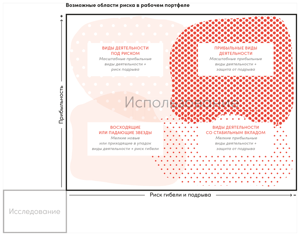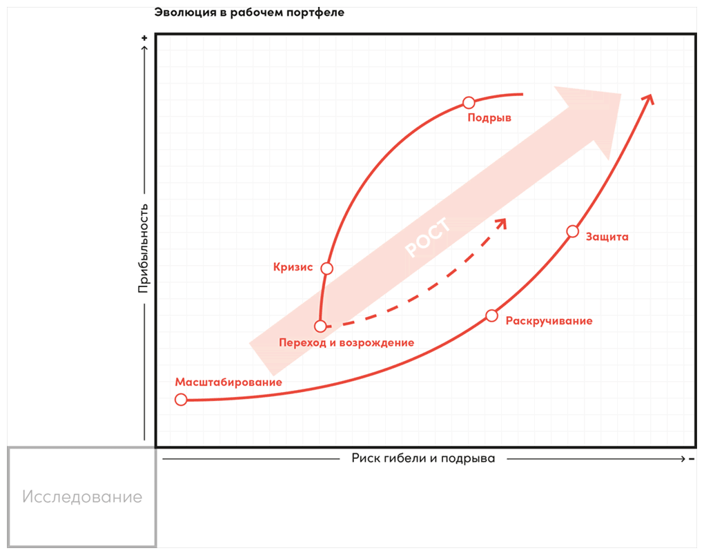 В рабочем портфеле эволюция того или иного бизнеса идет в направлении роста и падения. Задача состоит в том, чтобы предотвратить упадок существующих бизнес-моделей посредством их защиты, совершенствования и преобразования.