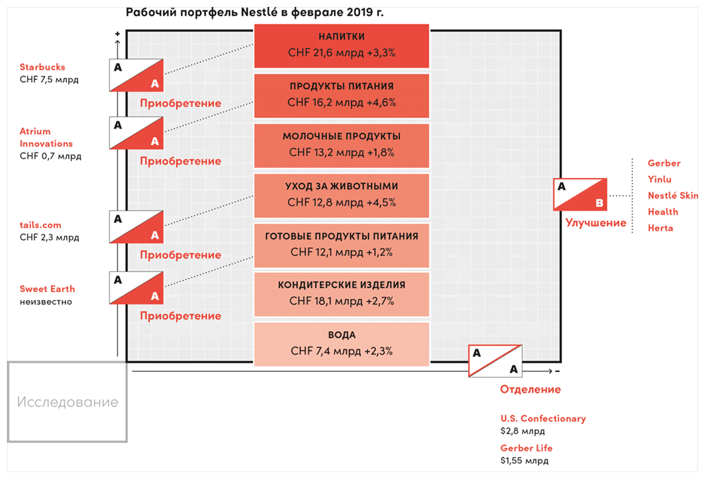 Nestlé адаптировала свой портфель посредством продажи некоторых активов. В 2018 г. она продала Ferrero – американское подразделение по выпуску кондитерских изделий за $2,8 млрд.