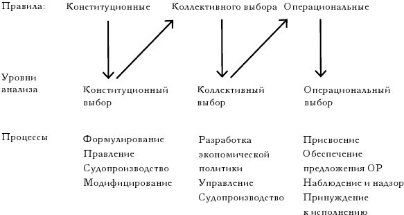 Большинство современных работ, посвященных проблемам ОР или близким к ним проблемам коллективного действия, фокусируют внимание на одном уровне анализа, исследуя то, что можно назвать операциональным уровнем (см. [Kiser, and E. Ostrom, 1982]). На операциональном уровне предполагается, что заданы и правила игры, и физические (технологические) ограничения, которые остаются неизменными на протяжении всего исследования в рамках его схемы. В рамках этого операционального уровня анализа действия индивидов непосредственно воздействуют на физический мир. Из ОР извлекаются ресурсные единицы. Затраты преобразуются в выпуск. Товары обмениваются. Проблема присвоения и проблема обеспечения предложения имеют место на операциональном уровне. Когда исследователь изучает ситуацию в ее операциональном аспекте, он должен предполагать, что технология и институциональные правила известны и неизменны. Однако и технологии, и правила подвержены изменениям во времени. Было показано, что исследовать технологические сдвиги значительно сложнее, чем производственные или потребительские решения, принимаемые в условиях фиксированной технологии (см. [Dosi, 1988], [Nelson and Winter, 1982]). Аналогично исследование институциональных изменений намного сложнее, чем анализ операционального выбора, который делается при заданном наборе правил[58]. Правила, воздействующие на операциональный выбор, были сформированы в рамках набора правил коллективного выбора, которые, в свою очередь, были сформированы в рамках набора правил конституционного выбора. Правила конституционного выбора для ситуаций и сред микроуровня испытывают воздействие правил коллективного выбора и правил конституционного выбора более крупных юрисдикций. Индивиды, имеющие способности к самоорганизации, осуществляют постоянные прямые и обратные переключения между площадками, на которых осуществляются операциональные, коллективные и конституционные акты выбора. В этом они находятся в точно таком же положении, что и менеджеры компаний реального сектора, постоянно переключающиеся с одних видов продукции на другие – в рамках существующей технологии, а также внедряющие новые (готовые к использованию) технологии и инвестирующие ресурсы в разработку и создание новых (не существующих сегодня) технологий. Так как в некоторых случаях, о которых речь в этой книге пойдет ниже, присваиватели ОР осуществляют прямые и обратные переключения между площадками, мы должны отбросить предположение, согласно которому достаточным будет одноуровневый анализ. Прежде всего существенно важно прояснить, что означает термин «институты».