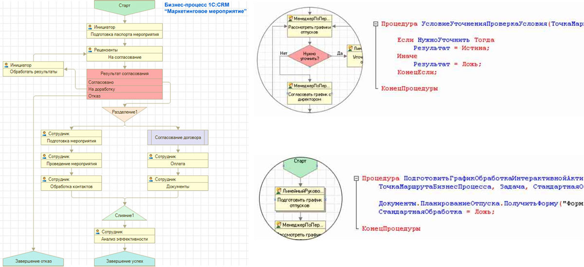 Благодаря автоматизации бизнес-процессов в коде «1С: Предприятие» система сама начинает следить за регламентом выполнения работ, тем самым исключается “человеческий фактор” и сокращается число ошибок. По мере продвижения бизнес-процесса по маршруту сотрудникам автоматически передается информация о результатах.