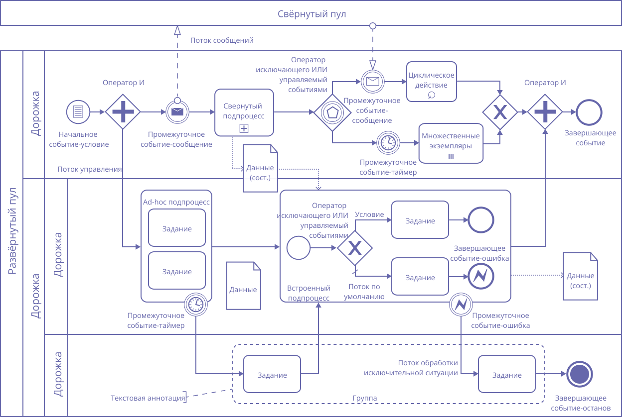 В отличие от дорожек, пулы объединяют целые бизнес-процессы, которые обязательно имеют стартовое и завершающее событие.