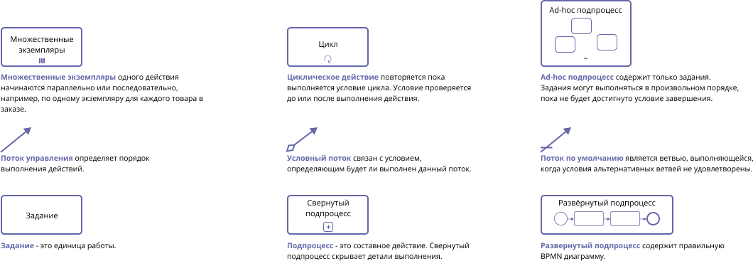 Основные элементы описания бизнес-процессов в «1С: Предприятие» включают в себя: