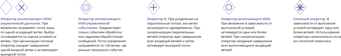 Логические операторы (или шлюзы) задают условия. Они используются как для разветвления одного потока управления на несколько, так и для объединения нескольких потоков в один.