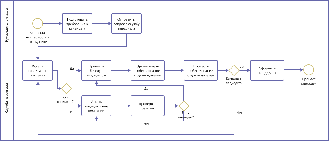 1. Подумайте, как может выглядеть бизнес-процесс набора персонала в вашей организации. Если вы не работаете, то придумайте гипотетический процесс.